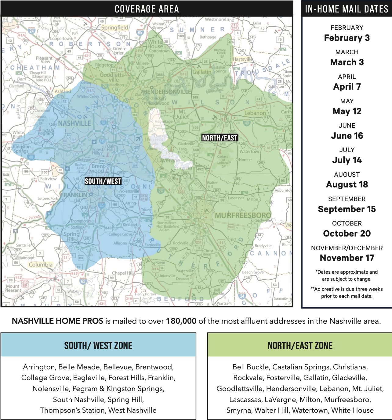 Nashville Home Pros Magazine reaches over 180,000 affluent homeowners across two key zones in the Greater Nashville area — South / West and North / East. Our distribution covers premium communities like Brentwood, Franklin, Green Hills, Belle Meade, Hendersonville, Gallatin, and Murfreesboro — ensuring your message connects with high-value homeowners ready to invest in their properties.